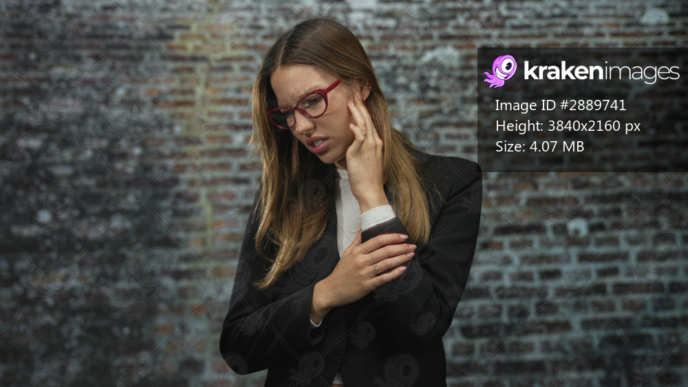 Woman holding ear with hand and clutching elbow while wincing in front of a brick building wall, wearing red glasses and black jacket; discomfort.