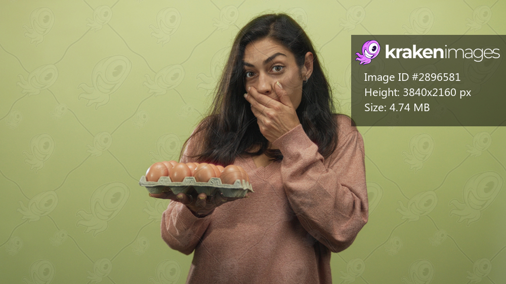 Woman holding egg carton and finger to lips for silence in a light green studio; secretive hush secrecy.