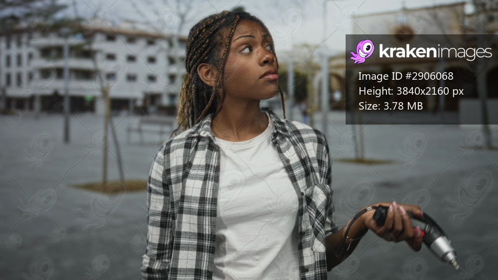 Woman holding electric drill in hand on street plaza, palm up questioning gesture, wearing plaid shirt; confusion uncertainty.