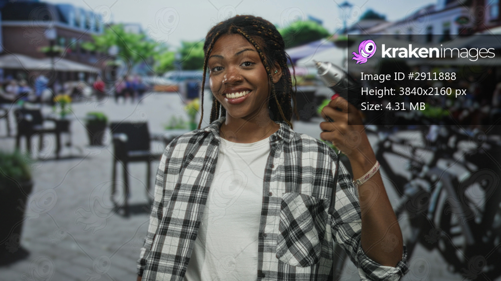 Woman holding electric drill and smiling, wearing plaid shirt and white tee, wrist bracelet and necklace visible in a busy street cafe scene; confidence urban craft. - Kraken Images