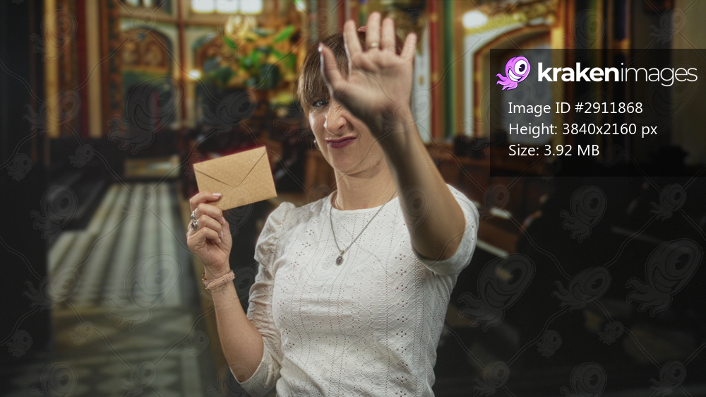 Woman holding envelope with hand extended as stop gesture while winking inside church building nave and pews; defiance secrecy privacy.