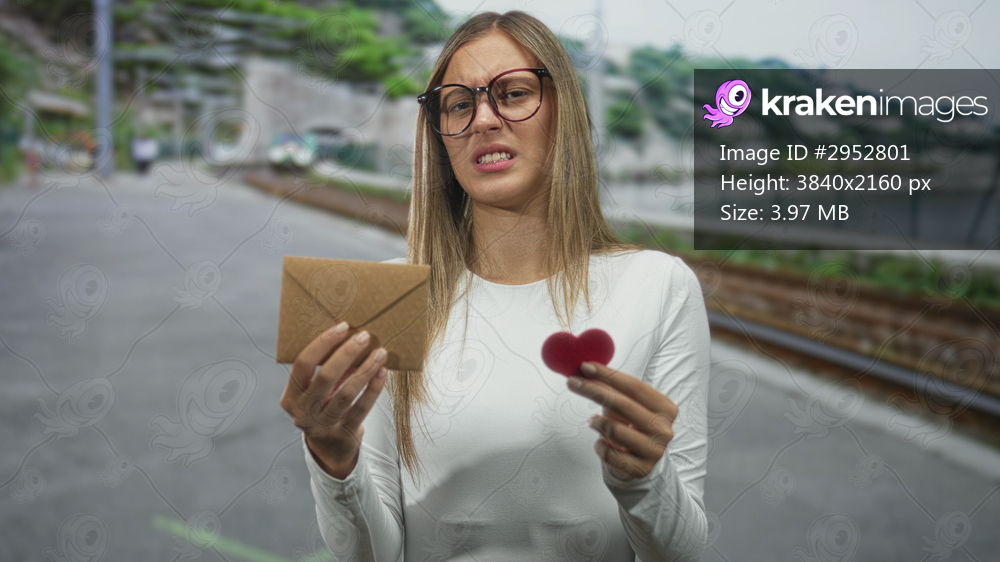 Woman holding envelope and small red heart on train platform near tracks, grimacing at the letter; rejection disgust.