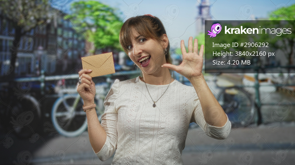 Woman holding envelope and waving hand on an amsterdam street, presenting a small kraft letter and palm gesture; happiness celebration.