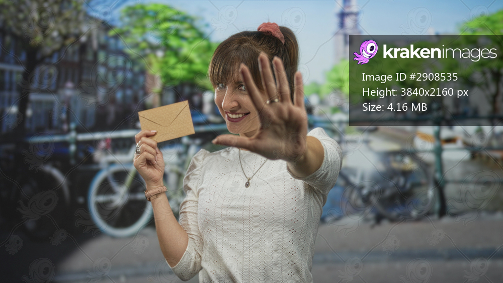 Woman holding envelope and waving hand on an amsterdam street, presenting a small kraft letter and palm gesture; happiness celebration.