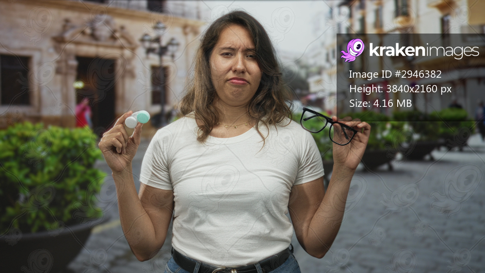 Woman holding eyeglasses and a contact lens case on a street, grimacing while comparing lenses to frames; eyewear annoyance.