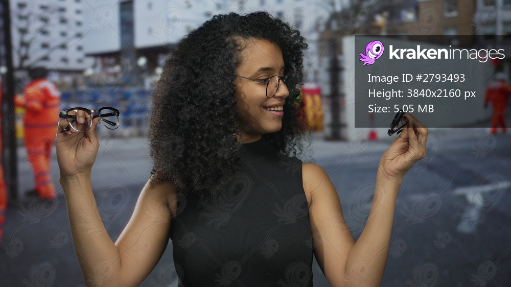 Woman holding eyeglasses outdoors at a bustling construction site with workers in orange attire, showcasing a contrast between modern fashion and industrial surroundings. - Kraken Images