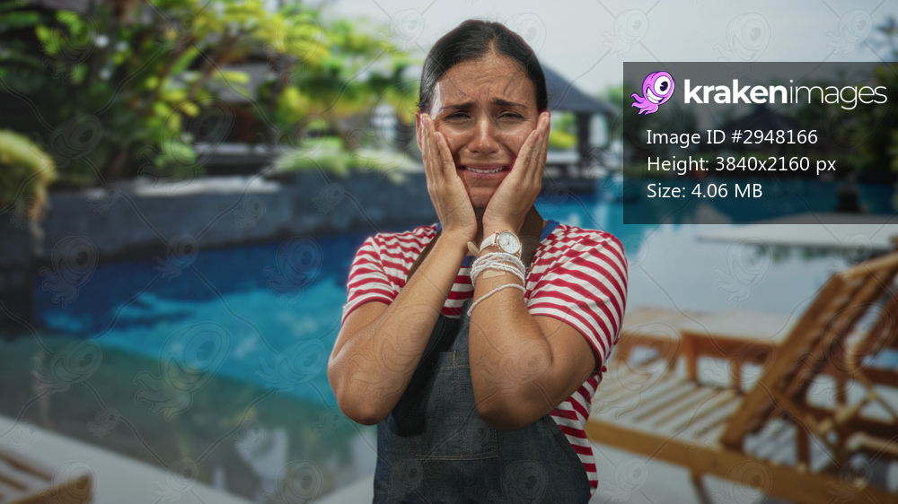 Woman holding face with hands by poolside building rubbing eyes and wincing wearing striped shirt and apron; distress fatigue.