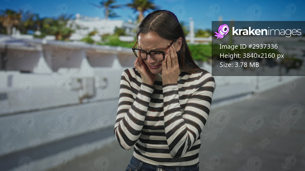 Woman holding face with hands, glasses visible, hands covering eyes on sunny street by white building and palm trees; sadness vulnerability.