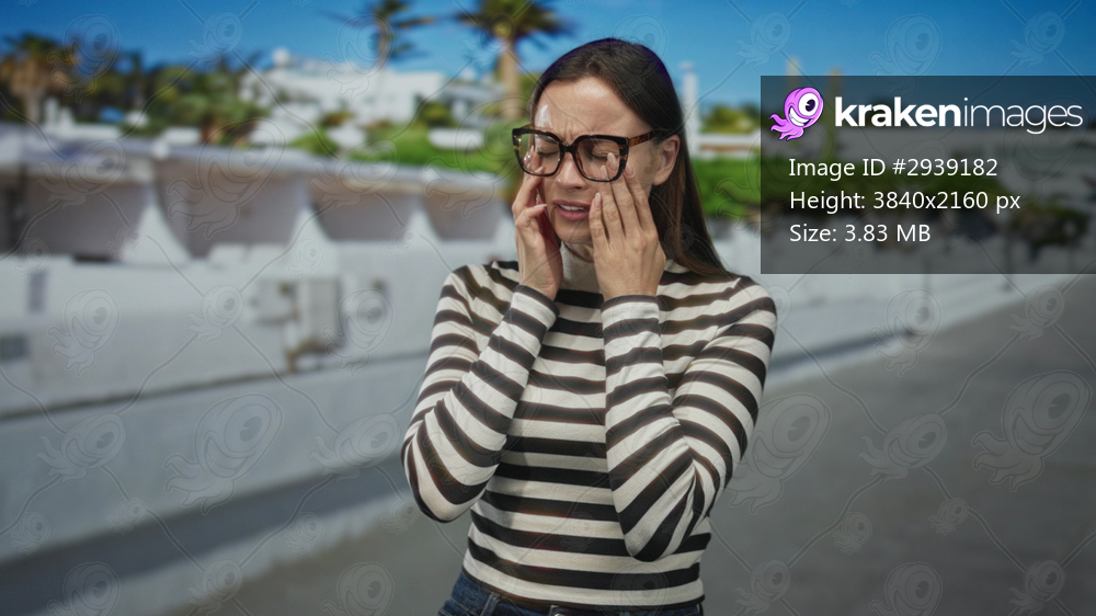 Woman holding face with hands, glasses visible, hands covering eyes on sunny street by white building and palm trees; sadness vulnerability.