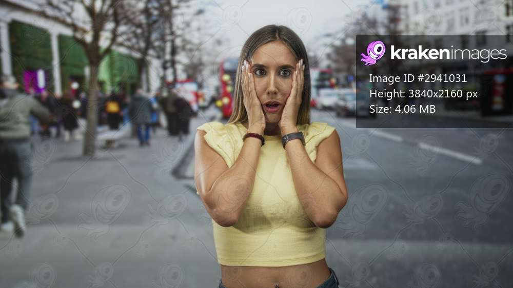 Woman holding face with hands on cheeks, mouth open, wearing sleeveless yellow shirt on busy city street with bus and crowd; surprise.