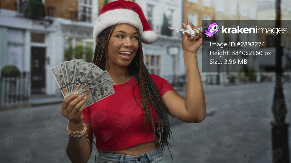 Woman holding fan of cash and toy airplane on street wearing santa hat and red shirt; holiday wealth joy.