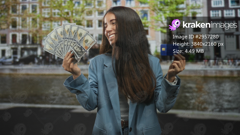 Woman holding fan of dollar bills and blue creditcard, hands visible on street by canal buildings; confidence prosperity.