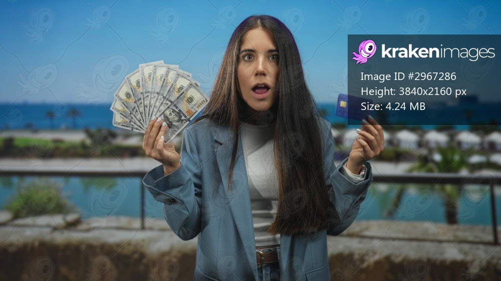 Woman holding fan of dollars and a creditcard, mouth open, hands visible with fanned bills on building balcony by the sea; surprise wealth.