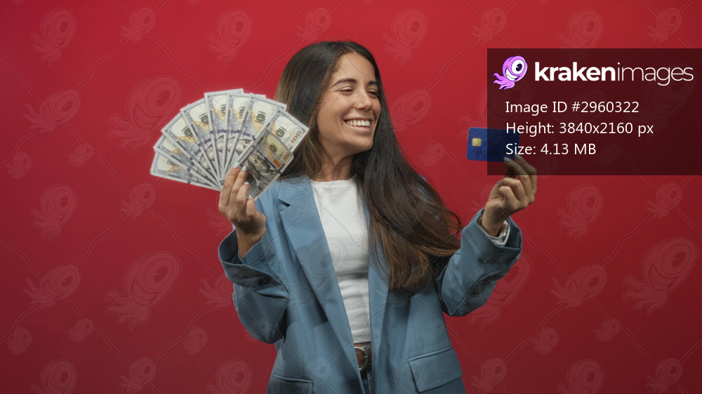 Woman holding fan of us dollars in one hand and displaying a blue creditcard with the other hand, smiling against a red studio backdrop; financial confidence success. - Kraken Images