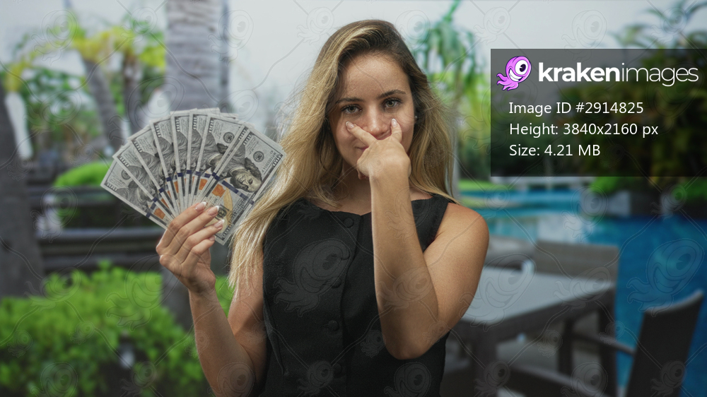Woman holding fanned cash in hand beside hotel building pool table showing victory sign and money fan; confidence wealth bragging.