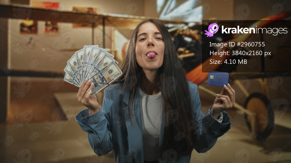 Woman holding fanned hundred dollar bills and blue creditcard, smiling and sticking tongue out in aviation museum building; playful confidence.