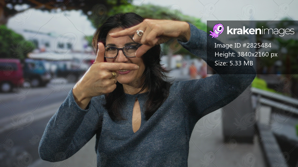 Woman holding fingers in framing gesture amidst blurred pedestrians on busy city street; creative vision.