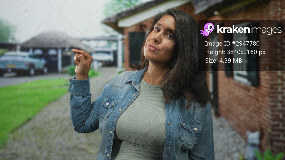 Woman holding fingers pinched and pursing lips in denim jacket on a cobbled street beside a brick house and parked cars; playful confidence.