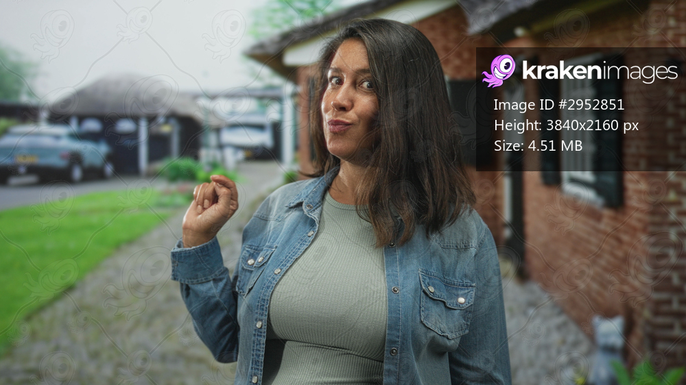 Woman holding fingers pinched and pursing lips in denim jacket on a cobbled street beside a brick house and parked cars; playful confidence.