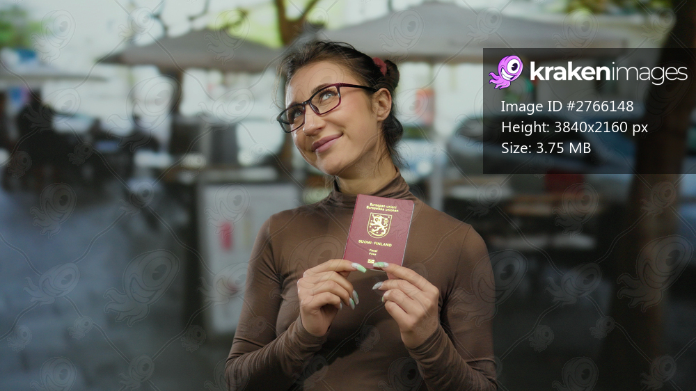 Woman holding finnish passport at an outdoor terrace restaurant setting, reflecting travel and identification themes.