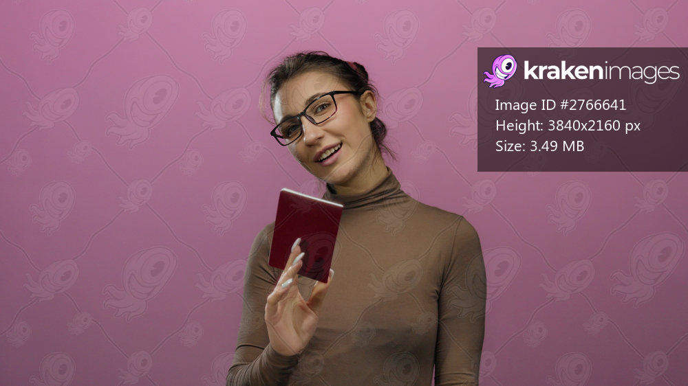 Woman holding finnish passport smiles against pink wall, showing identification and travel readiness.