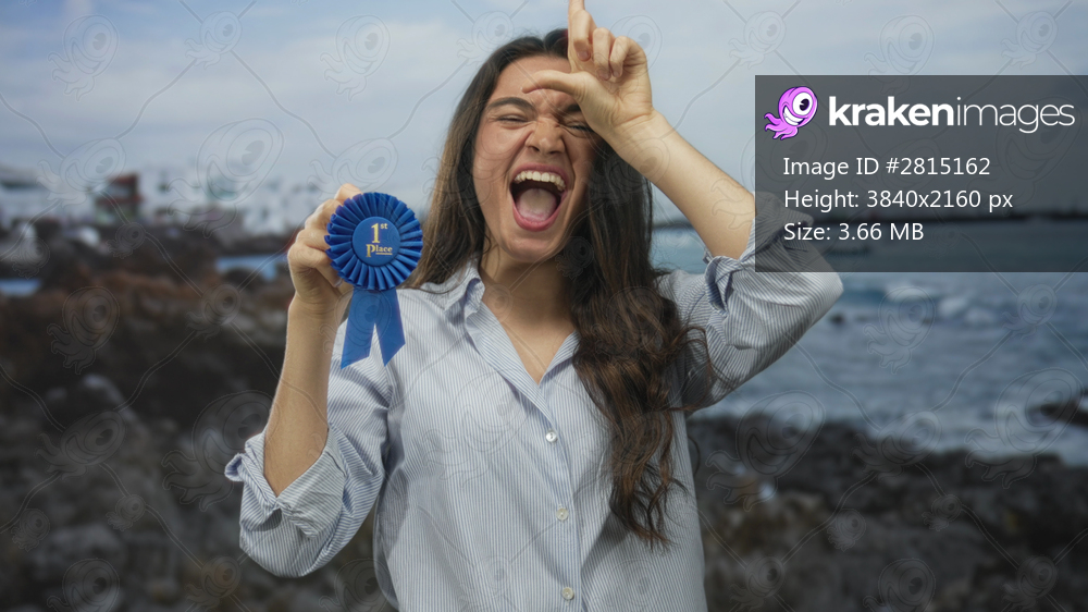 Woman holding first place rosette with finger to forehead l gesture at beach while smiling; ironic triumph.