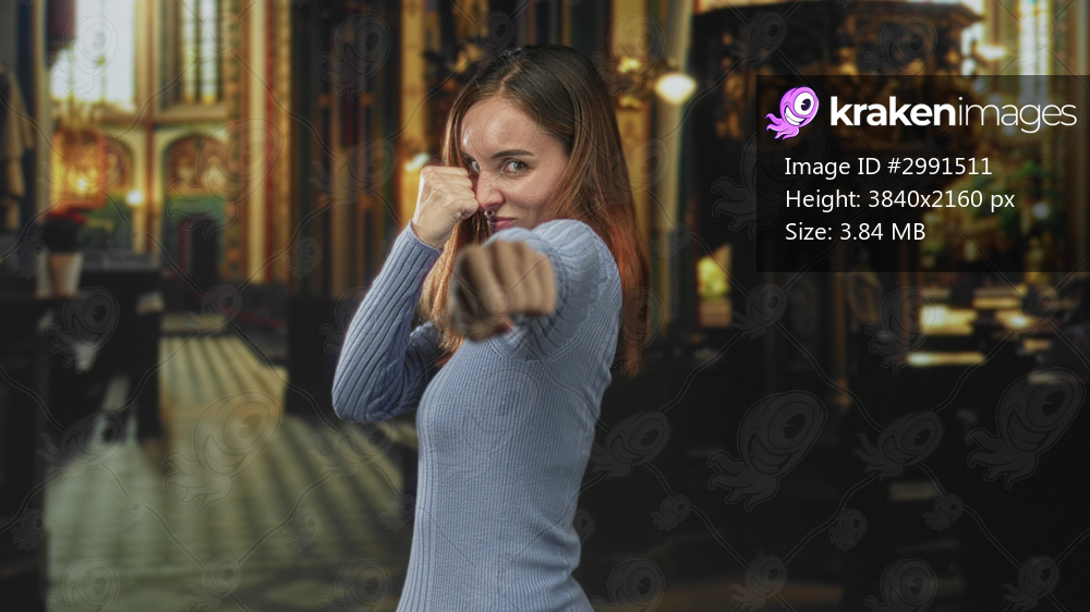 Woman holding fists to her face and throwing a punch in an ornate building; defiance strength resilience.