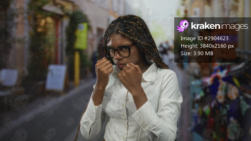 Woman holding fists up in a guarded boxing stance on a bustling city street with braided hair, glasses and white shirt visible; determination.