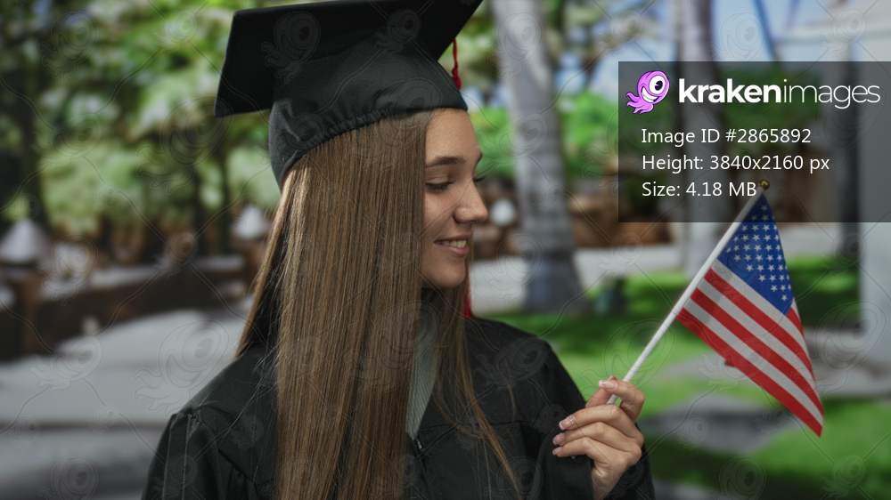 Woman holding flag in park, smiling in black graduation cap and gown with red tassel, standing on green lawn by benches; pride.