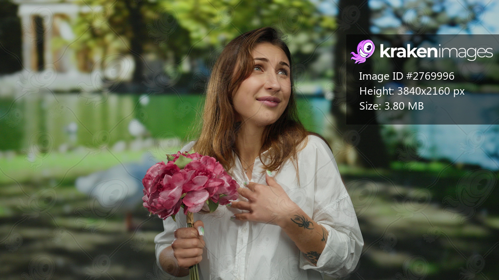 Woman holding flowers in a park with vibrant green trees, wearing a white shirt with a tattoo on her arm, expressing gratitude and happiness under sunny weather. - Kraken Images