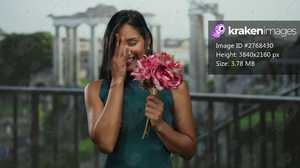 Woman holding flowers and smiling at roman ruins, showcasing ancient history, culture, travel, and emotion against a picturesque outdoor backdrop.