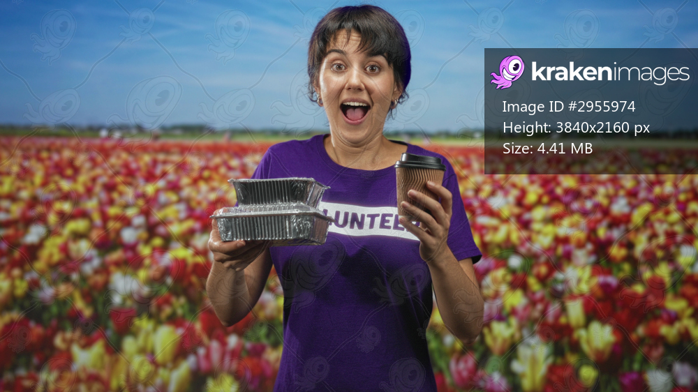 Woman holding foil food containers and coffee cup, hands visible and smiling with open mouth in studio; community service joy.