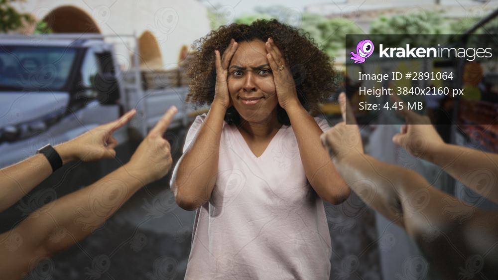 Woman holding forehead as several hands point fingers at her on a construction street; anxiety blame isolation.