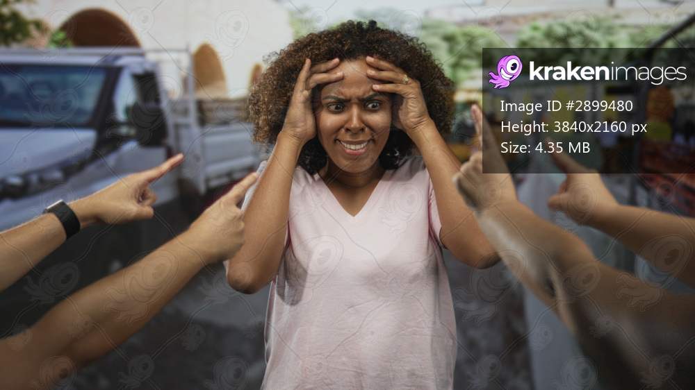 Woman holding forehead as several hands point fingers at her on a construction street; anxiety blame isolation.