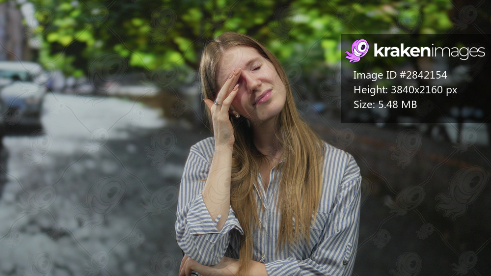 Woman holding forehead with her eyes closed in a busy urban street scene lined with leafy trees and parked cars; stress.