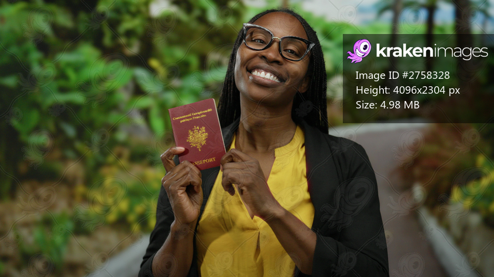 Woman holding french passport in outdoor park setting, wearing glasses and yellow shirt, smiling with greenery in background, embodying travel and diversity. - Kraken Images