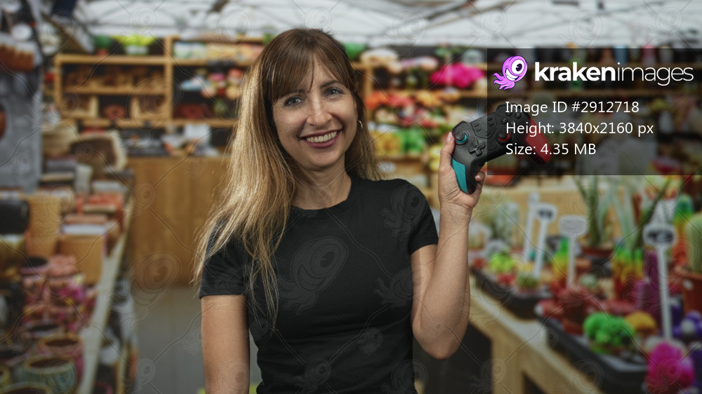 Woman holding game controller with raised right hand inside a market building, smiling at camera; play hobby joy.