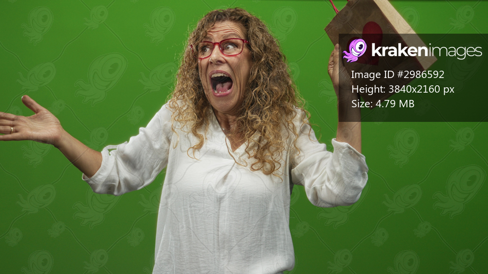 Woman holding gift bag with red heart, hand to mouth and open mouth expression in studio; surprise giving.