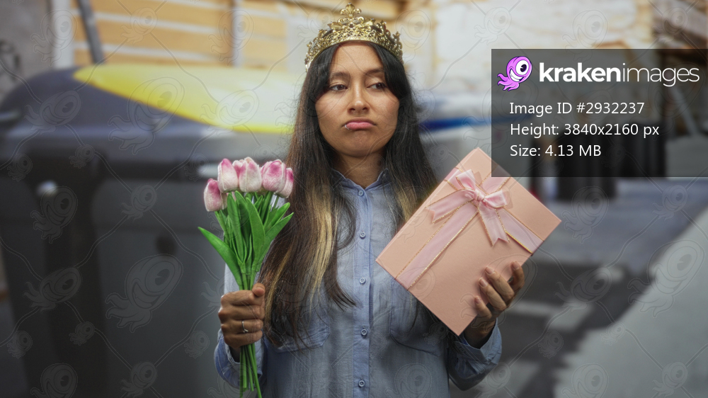 Woman holding gift and bouquet wearing crown near recycling container on city street, hands and face visible; disappointment.