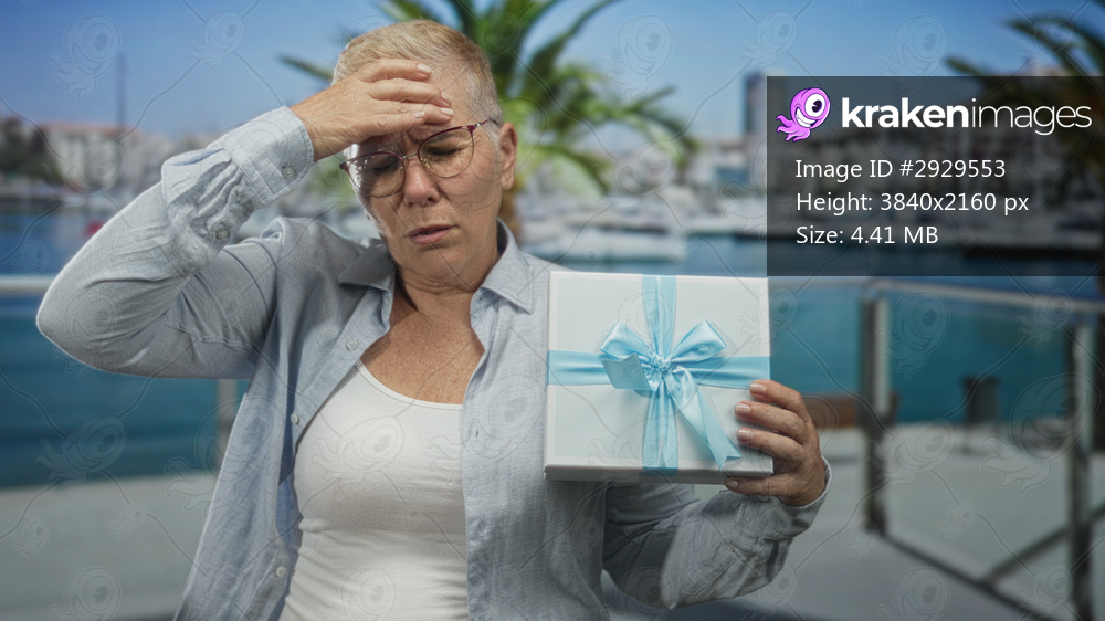 Woman holding gift box with blue ribbon, hand on forehead visible on street by marina with boats and railing; anxiety.
