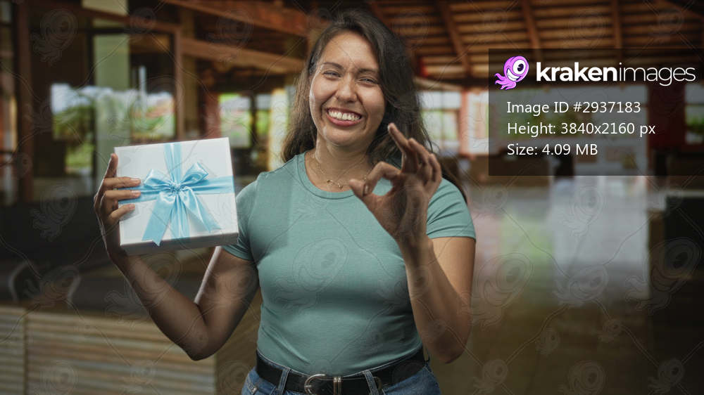 Woman holding gift box with blue ribbon, making ok sign and smiling in a hotel lobby while presenting it; celebration joy.