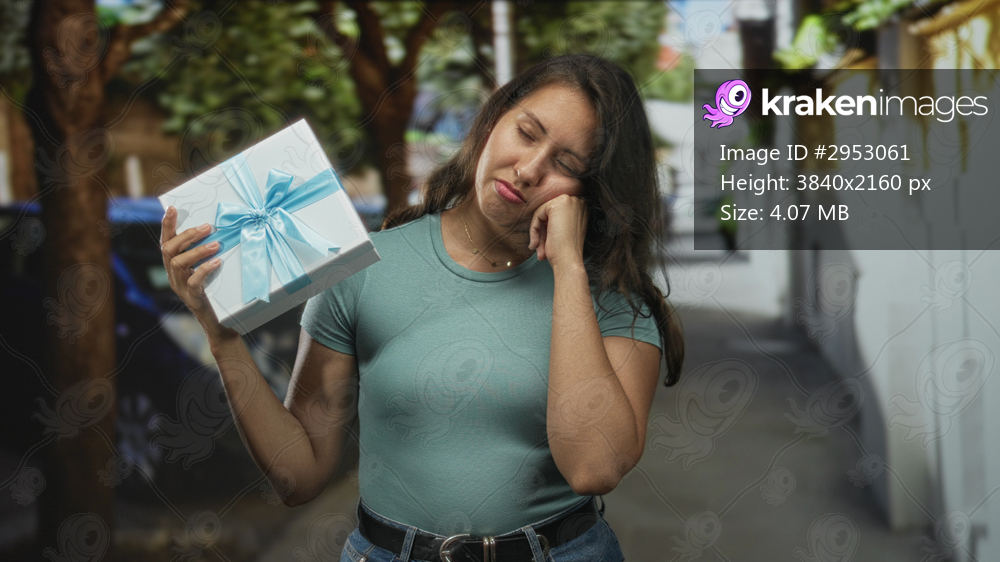 Woman holding gift box with blue ribbon and resting cheek on hand on a city street in daylight; disappointment alone reflection.