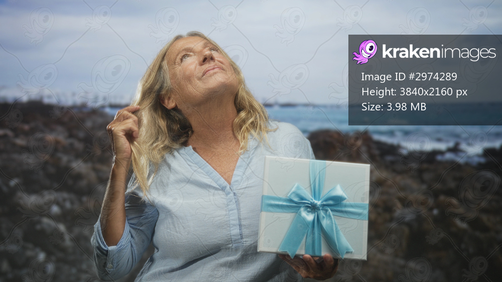 Woman holding gift box with blue ribbon, touches hair while looking up on rocky shore studio; serenity gratitude.