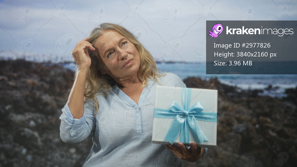 Woman holding gift box with blue ribbon, touches hair while looking up on rocky shore studio; serenity gratitude.