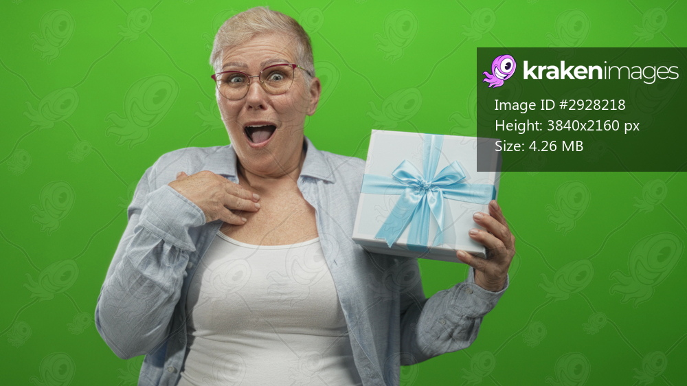 Woman holding gift box with hand to mouth gesture in studio with green screen; surprise joy celebration.