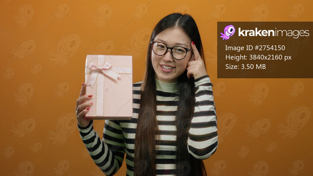 Woman holding gift box in front of orange background showcasing playful expression with long hair and glasses wearing striped sweater emphasizing festive mood. - Kraken Images