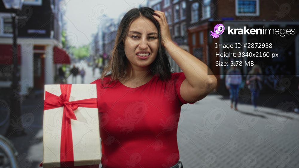 Woman holding gift box with red ribbon, hand on head on street by city buildings and pedestrians; frustration mixup.