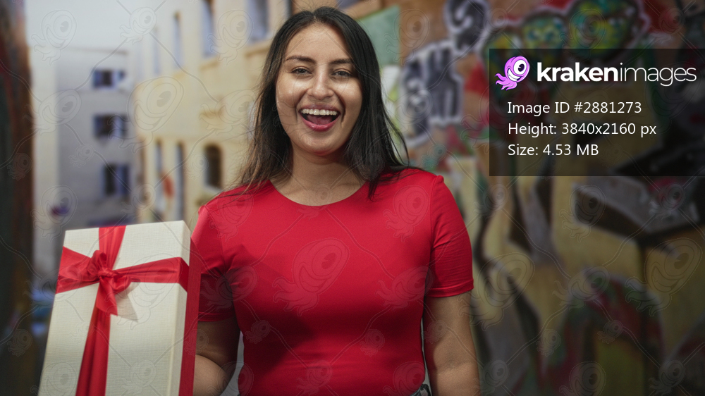 Woman holding gift box with red ribbon and smiling face on street with colorful graffiti; joy celebration giving.