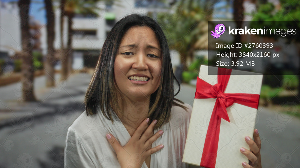 Woman holding gift box with red ribbon smiling on city street outdoors expressing happiness.