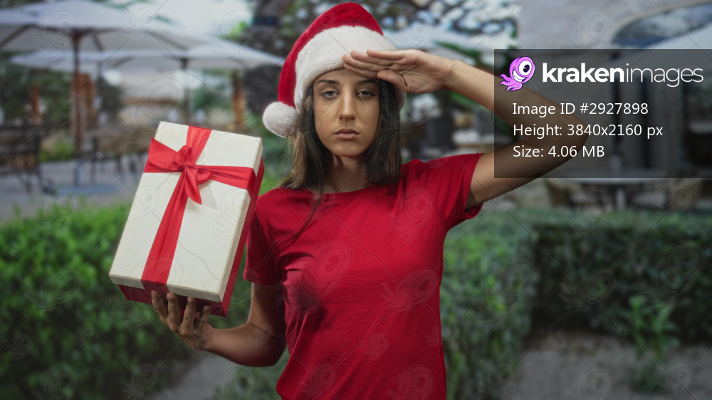 Woman holding gift box and saluting on restaurant terrace outdoors wearing santa hat and red shirt; holiday duty.
